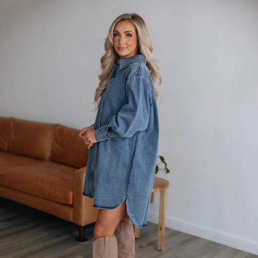 Damjacka i Denim – Oversize Passform – Knäppning – Bröstfickor – Långärm