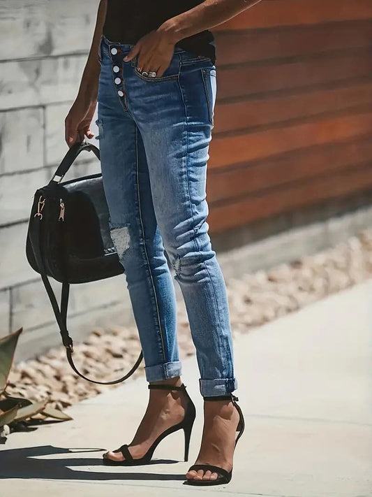 Damjeans - Slim Fit Denim - Knappgylf - Croppad Längd - Trendig Used-Look