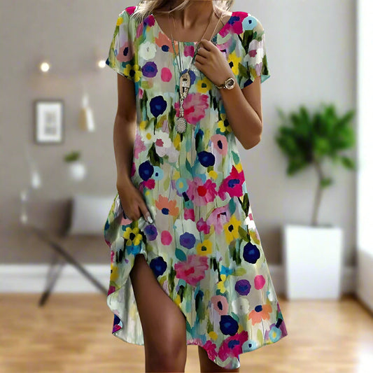 Damklänning - Blommig A-linje - Kortärmad - Rund hals - Ledig passform