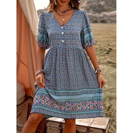 Damklänning - Blommig puffärm - Knappar i bohemisk stil