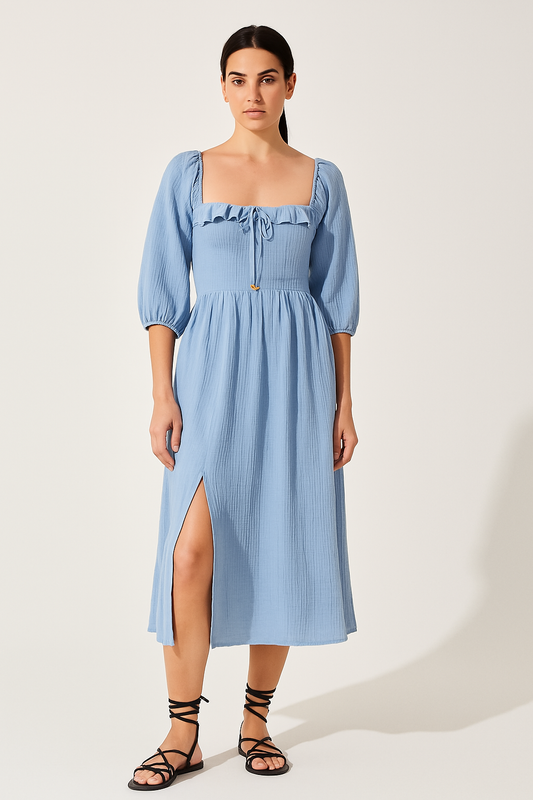 Damklänning A-linje – Bomull – Ståkrage – Volangärmar – Knälång Passform