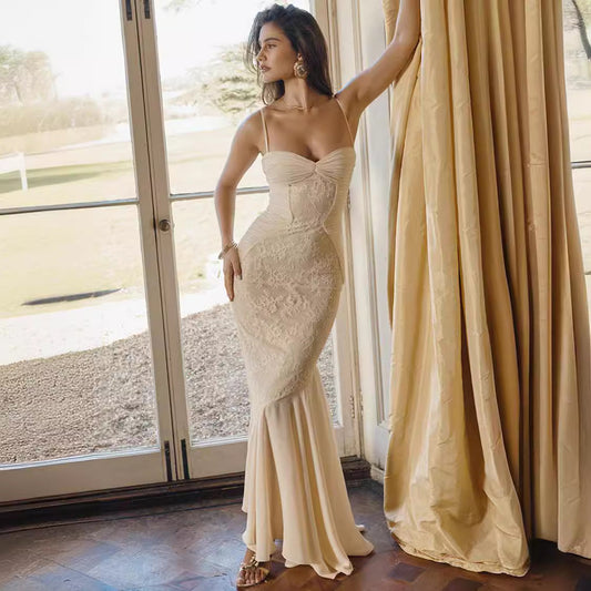 Damklänning för fest – Slim fit – Broderat mesh – Spagettiband – Öppen rygg