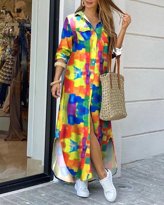 Damklänning maxi – avslappnad passform – bomullskänsla – knappfront – geometriskt mönster