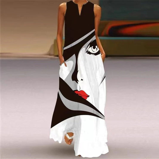 Damklänning maxi – axelbandslös bomullsblandning – abstrakt mönster – luftig passform