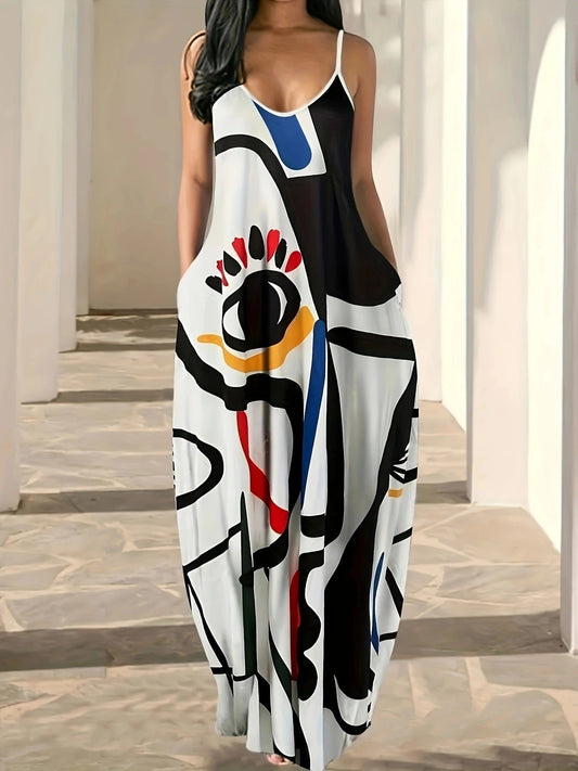 Damklänning maxi – lös passform – bomullsblandning – spagettiband – abstrakt mönster