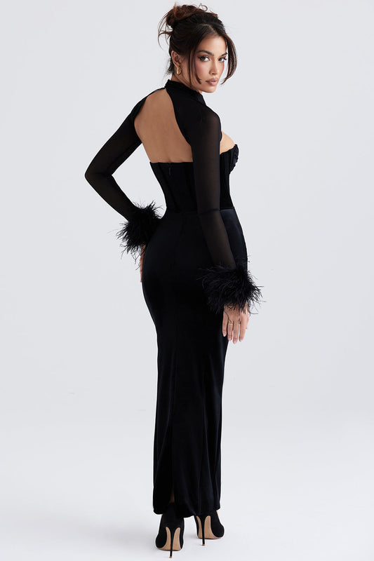 Damklänning maxi – sammet – korsettliv – transparenta ärmar – fjädermanschetter