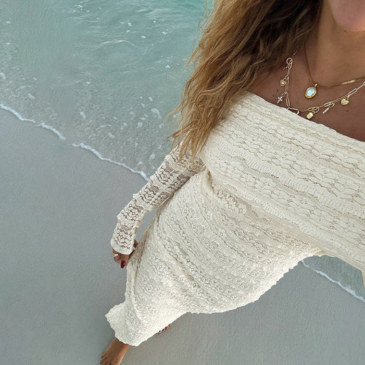 Damklänning maxi – smal passform – off-shoulder spets – långärmad elegant festklänning