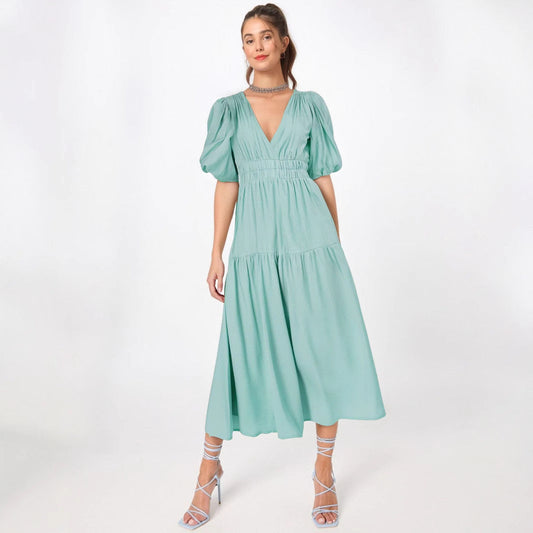 Damklänning midi – Djup V-ringning – Puffärmar – Figursydd midja – Volangkjol