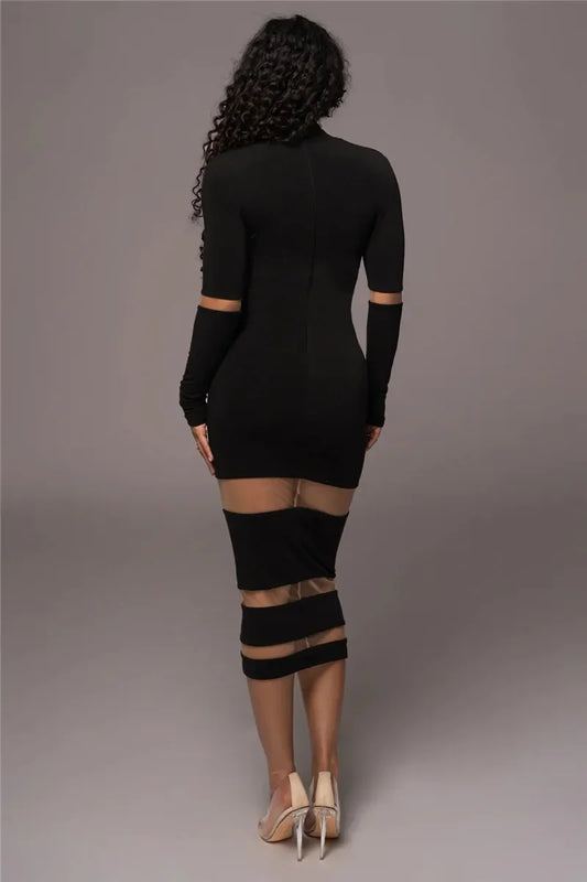 Damklänning midi – Figurnära passform – Hög hals – Långa ärmar – Utskurna detaljer