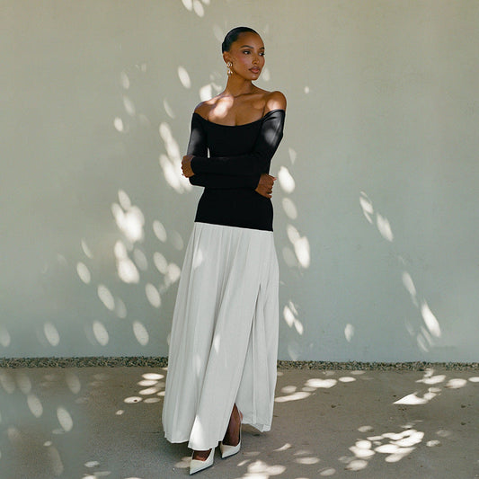 Damklänning off shoulder – figurnära överdel – lång ärm – plisserad maxikjol