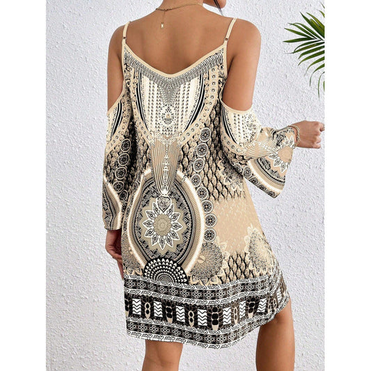 Damklänning off-shoulder – Vid passform – Blandmönstrad – Klockärmar – Bomullsblandning