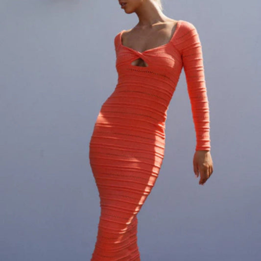 Damklänning stickad – Slim Fit – Hellång – Twistad halsringning – Utskuret bröstparti – Lång ärm