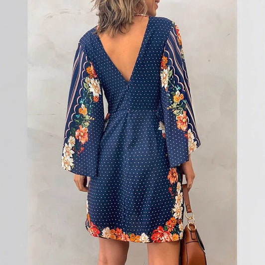 Damklänning – Boho Stil – Blommigt Mönster – V-ringning – Långa Ärmar – Lös Passform