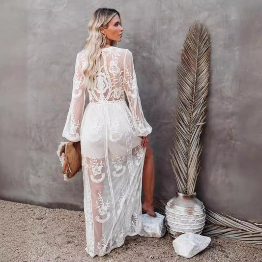 Damklänning – Hellång – Broderad Spets – V-Ringning – Lös Passform Kort Ärm