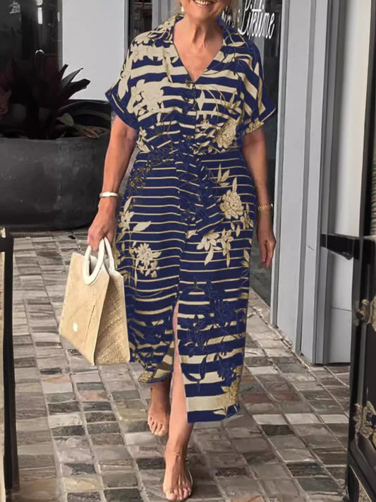 Damklänning – Kort ärm – Knäppning – Växtmönster – Midjebälte – Slits – Midi