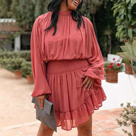 Damklänning – Långärmad Luftig Design – Smockad Midja – Kort Volangkjol
