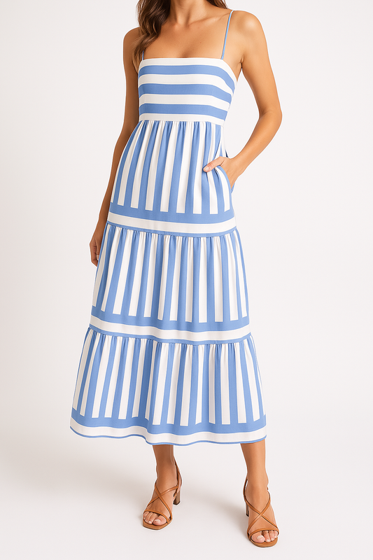 Damklänning – Lätt bomull – A-linjeformad – Midi – Randig med volanger och smala axelband