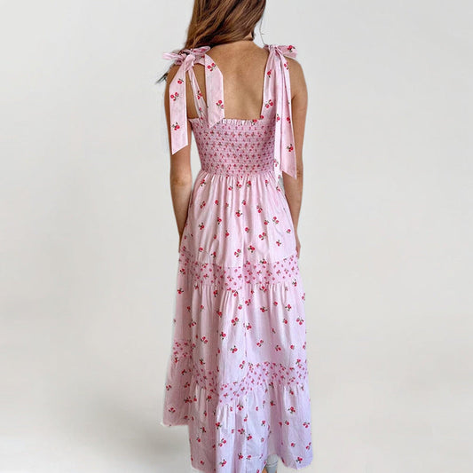 Damklänning – Smockad Livdel – Rynkade Axelband – A-linjeformad Lagerdesign – Andningsbart Tyg