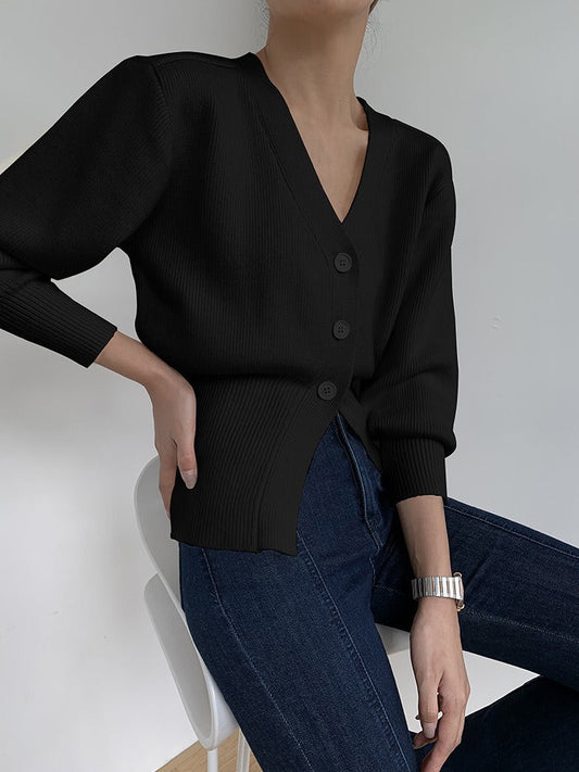 Damkofta – Ribbstickad – Oversize Passform – Knäppning – V-Ringning – Droppad Axel