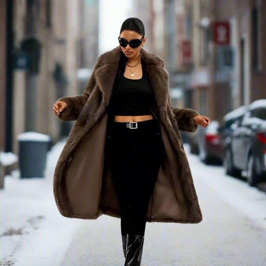 Dammode Lång Pälsjacka – Lyxig och Voluminös – Vid Krage och Elegant Passform