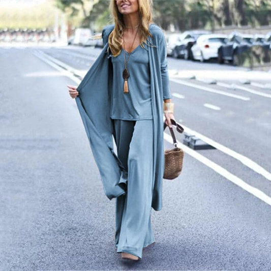 Damset med 3 delar – Lång kofta, topp med v-ringning, vida byxor – Elegant och bekvämt