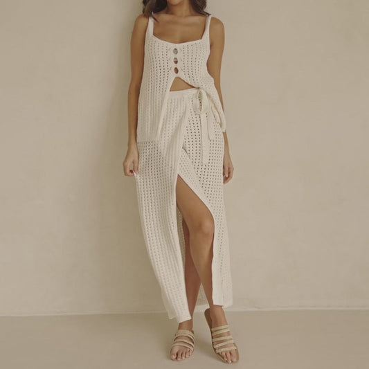 Damset strandkläder – Mjukstickad topp med knappar – Slitskjol med knytband