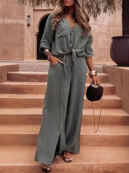 Damset med vida byxor – Linne bomull – Avslappnad passform – Knappdetaljer