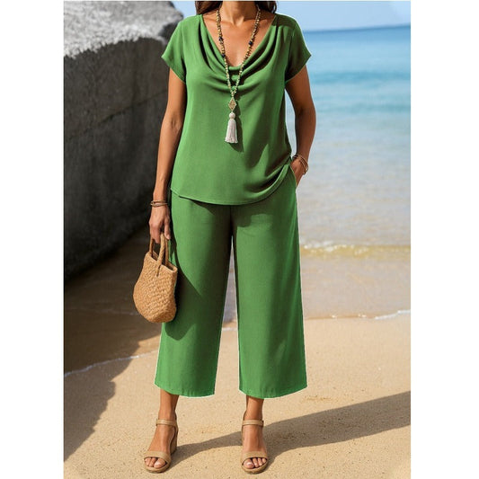 Damset – Avslappnad Passform – Draperad Krage – Kortärmad Topp – Vida Croppade Byxor