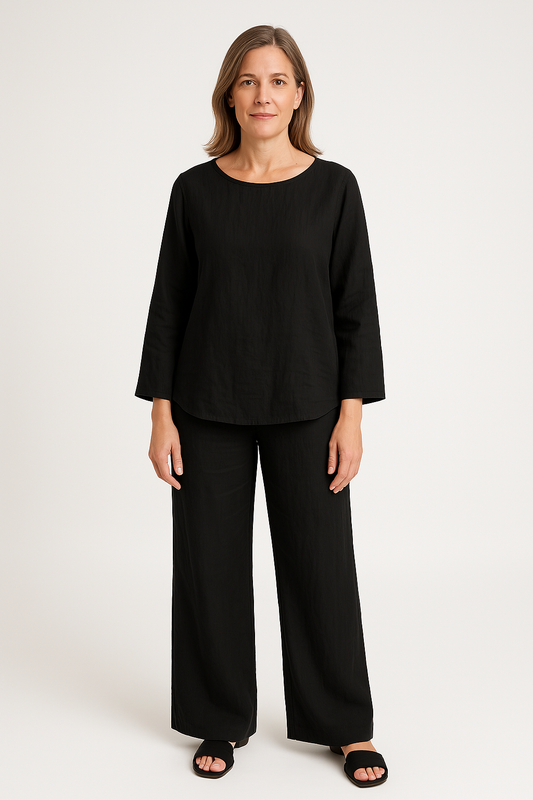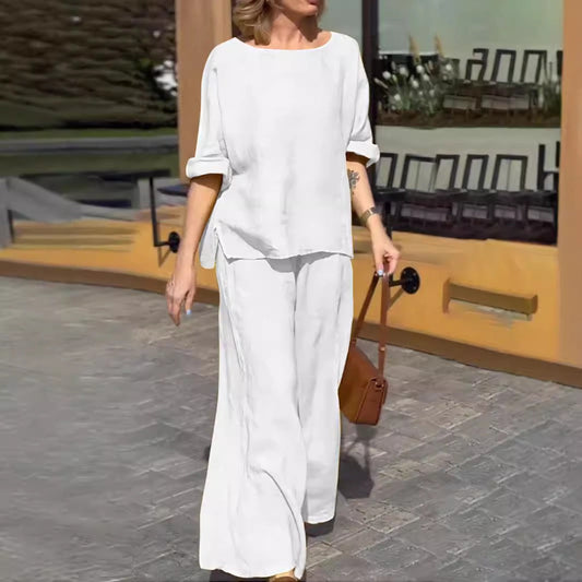 Damset – Linne – Avslappnad långärmad topp – Vida byxor med knapplist