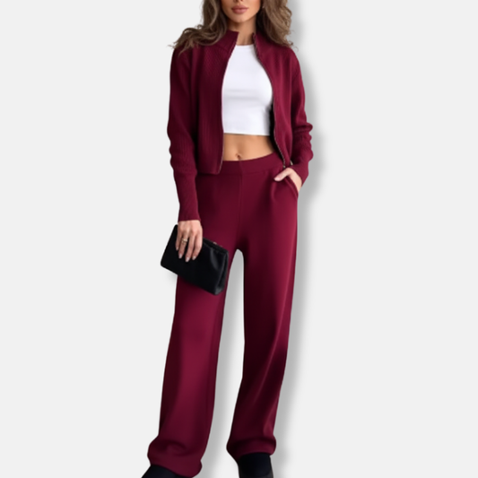 Damset – Stickad Tvådelad Outfit – Kort Tröja med Dragkedja – Vida Högmidjade Byxor