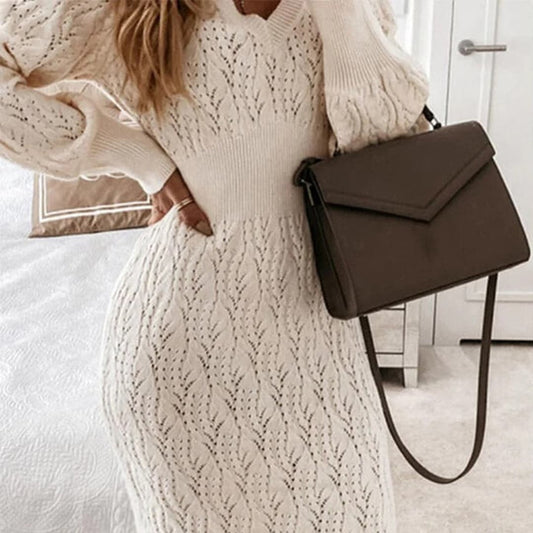 Damstickad klänning - Figurnära passform - V-ringning - Långärmad med puffaxlar