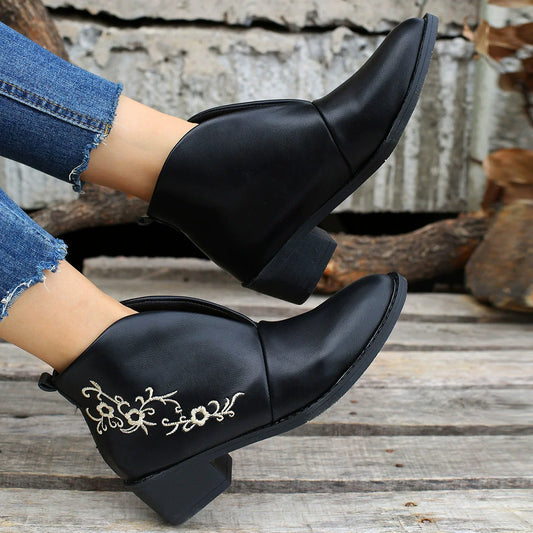 Damstövletter – Låg Blockklack – Blombroderi – V-skuren Ankel – Rund Tå