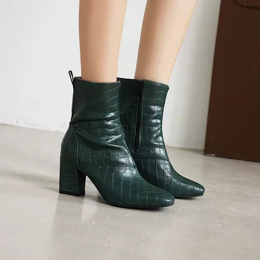 Damstövletter – Präglad Reptilmönster – Fyrkantig Tå – Blockklack – Dragkedja