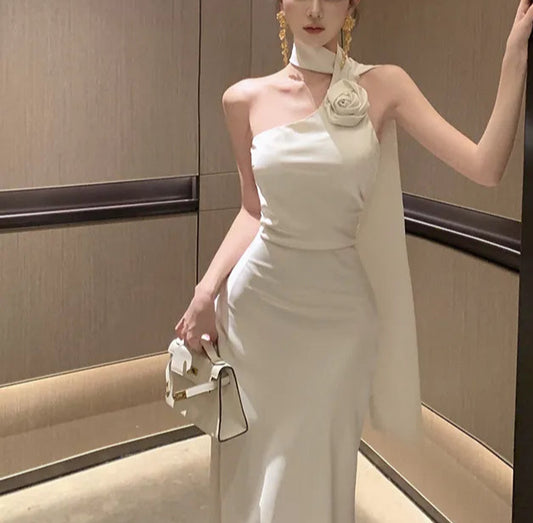 Elegant satinklänning med en axel för kvinnor – Aftonklänning i maximodell