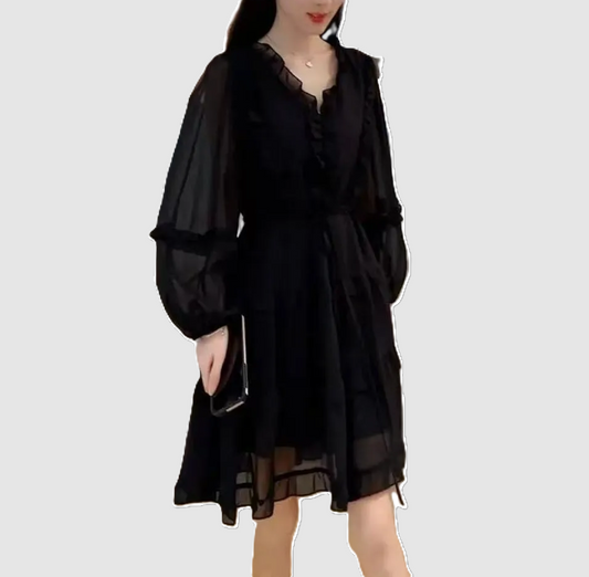 Elegant svart damklänning - V-ringad - Volangkant - Långa ärmar