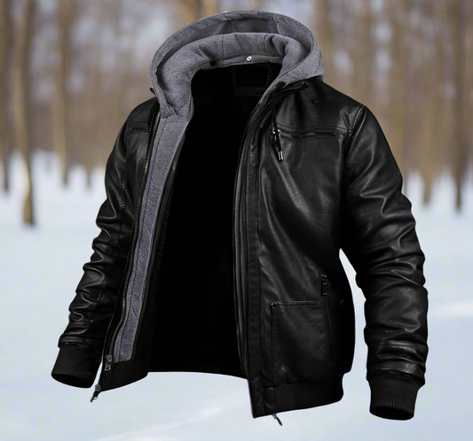 Herr Bomberjacka - Imitationsläder - Avtagbar Huvtröja - Ribbad Kant - Flera Fickor