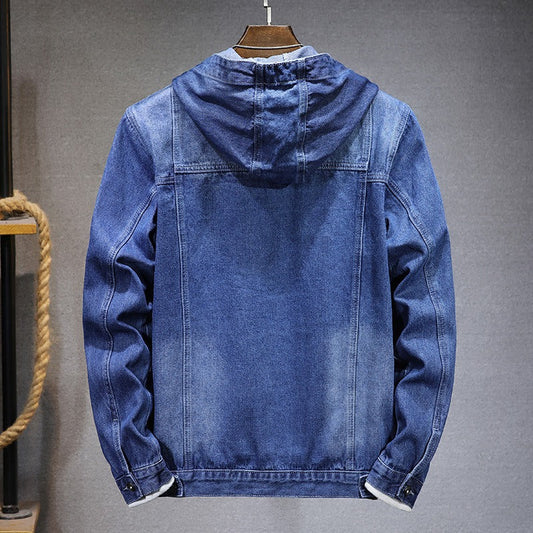 Herr Jeansjacka – Slim Fit – Stickad Huva och Ärmar – Knäppning Framtill
