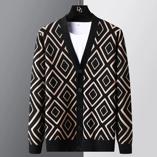 Herrkofta – Avslappnad Passform – Ullstickad – Mönstrad – Krage – Knäppning Fram