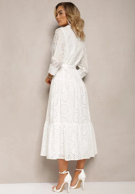 Klänning dam midi – broderie anglaise – avslappnad passform – skärp i midjan – knappframtill