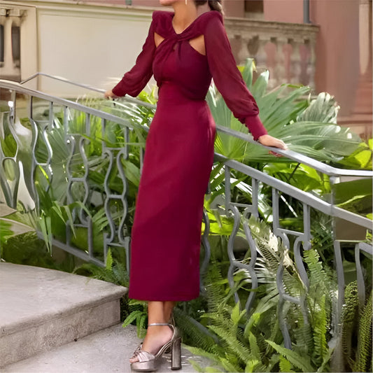 Klänning Dam – Elegant Figurnära Passform – Twistdetalj & Utskurna Axlar – Långa Skira Ärmar