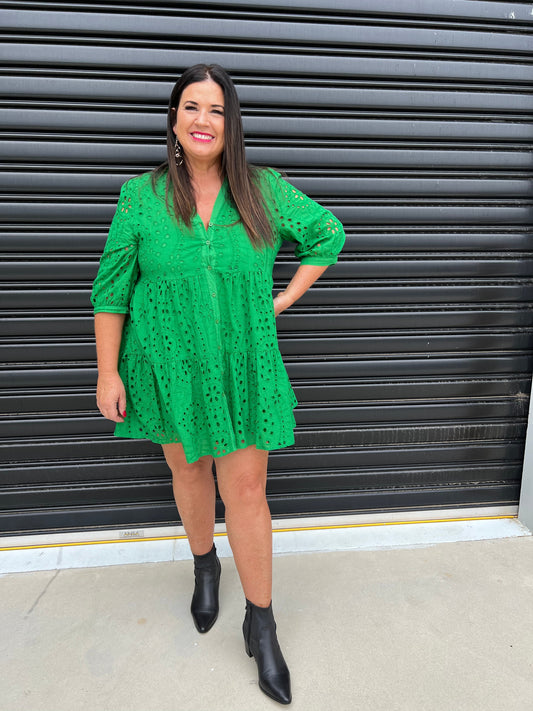 Klänning för dam – A-linjeformad – Broderie Anglaise – Trekvartsärm – Knäppning fram