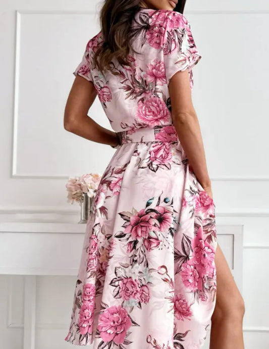 Blommig omlottklänning för kvinnor - V-ringad - Knytband i midjan - Kort ärm