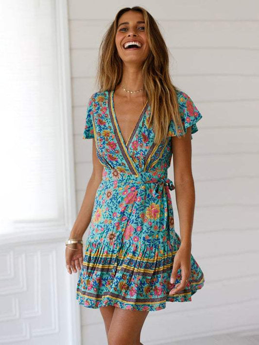 Dam Klänning - V-ringning Omlott - Korta Volangärmar - Blommigt Mönster - Luftig & Bekväm