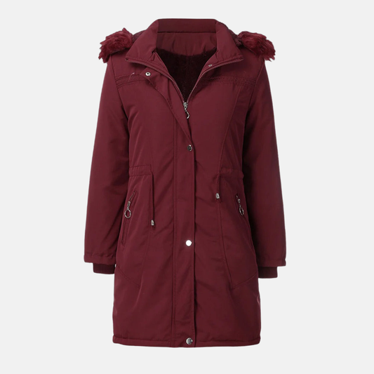 Dam Lång Jacka med Huva – Varmt Foder – Dragsko i Midjan – Fuskpälsdetalj