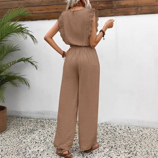 Dam Loungewear Set – Ärmlös Spetsdetalj Topp – Vida Byxor – Dragsko Midja