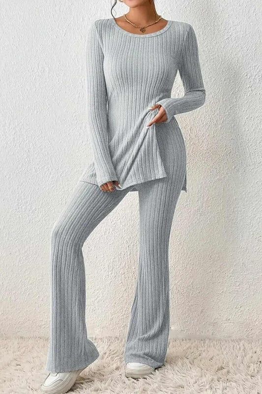 Dam Loungewear Set - Ribbad Stickad - Långärmad Tunika - Hög Midja Vida Byxor