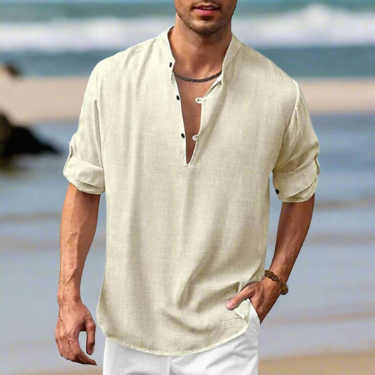 Herrskjorta - Luftig Bomull/Linne - Avslappnad Passform - Mandarin Krage - Långärmad