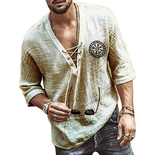 Herrskjorta - Linneblandning - Lös Passform - Snörad V-hals - 3/4-Ärmar
