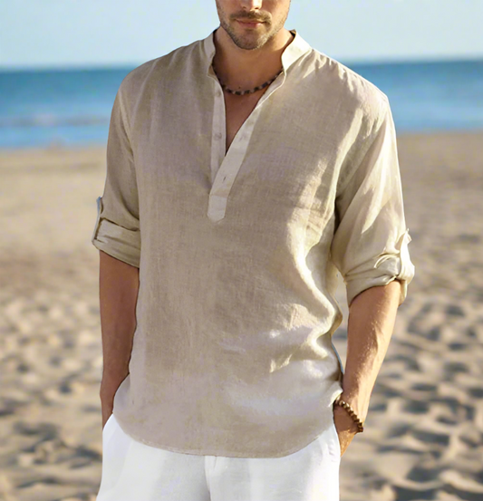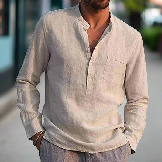 Herrskjorta - Linnebomull - Lös Passform - Mandarin Krage - Långärmad Luftig Design