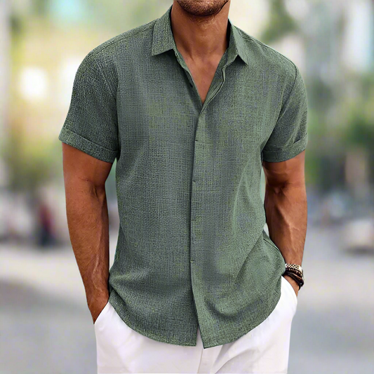 Herr Skjorta - Kortärmad Linneblandning - Avslappnad Passform - Knäppning